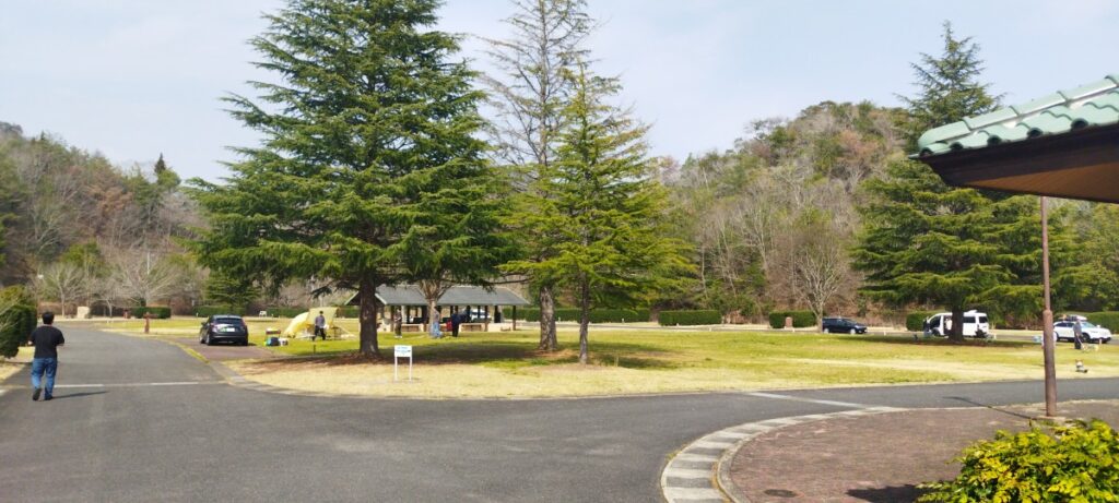 芦田湖オートキャンプ場は、芝生の中心に炊事場があり、その外周をぐるっと車道が一周できるレイアウトになっています。