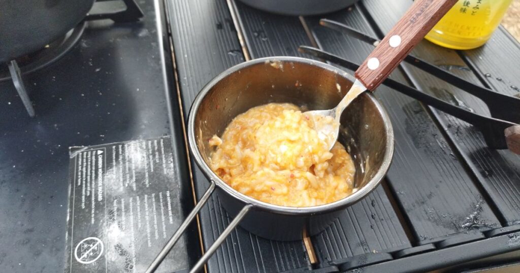 朝食は、昨日の鍋の残りを温めなおして、そこにごはんパックを投入。