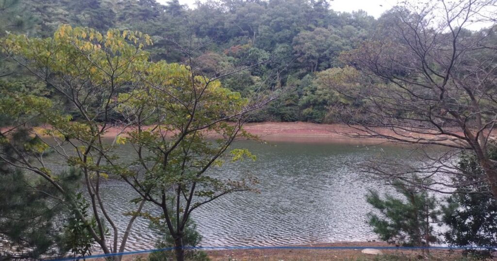 池の底が見えるほどに水位が下がっていて、まるで別の場所に来たような光景です。