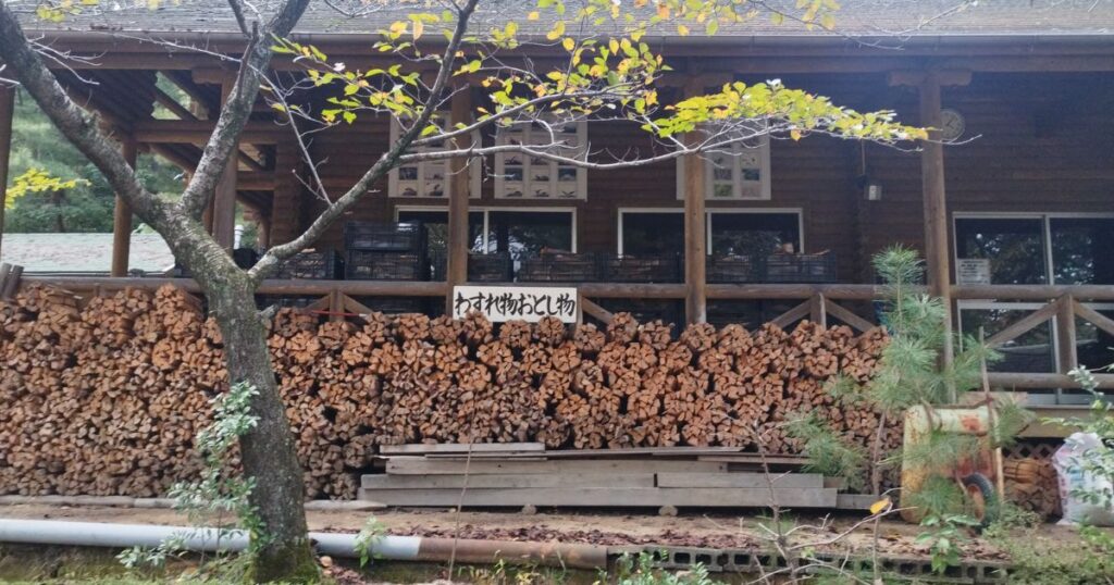 管理棟まで戻ってくると、きれいに積み上げられた薪が目に入りました。