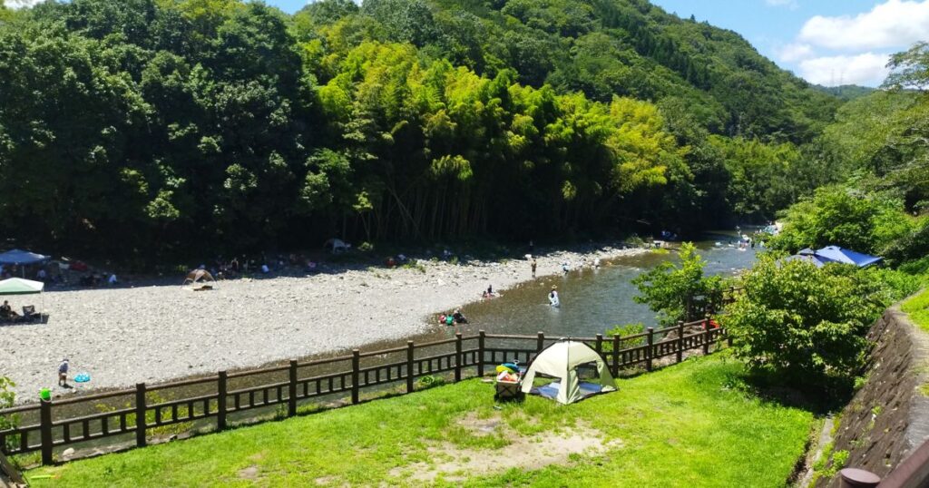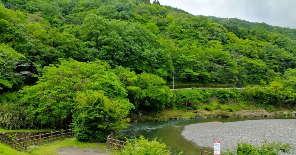 ここ天神峡キャンプ場で、のぶるさんのソロキャンプが始まります。