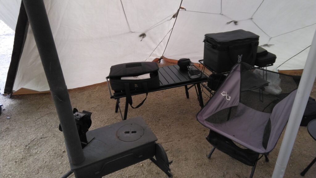 テントの跳ね上げをやめ、お籠りキャンプの準備を開始。