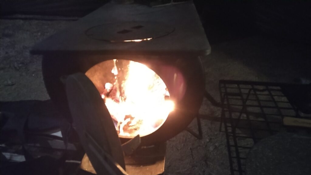 最近は耐熱ガラス式で炎が見える焚き火台も多いが、